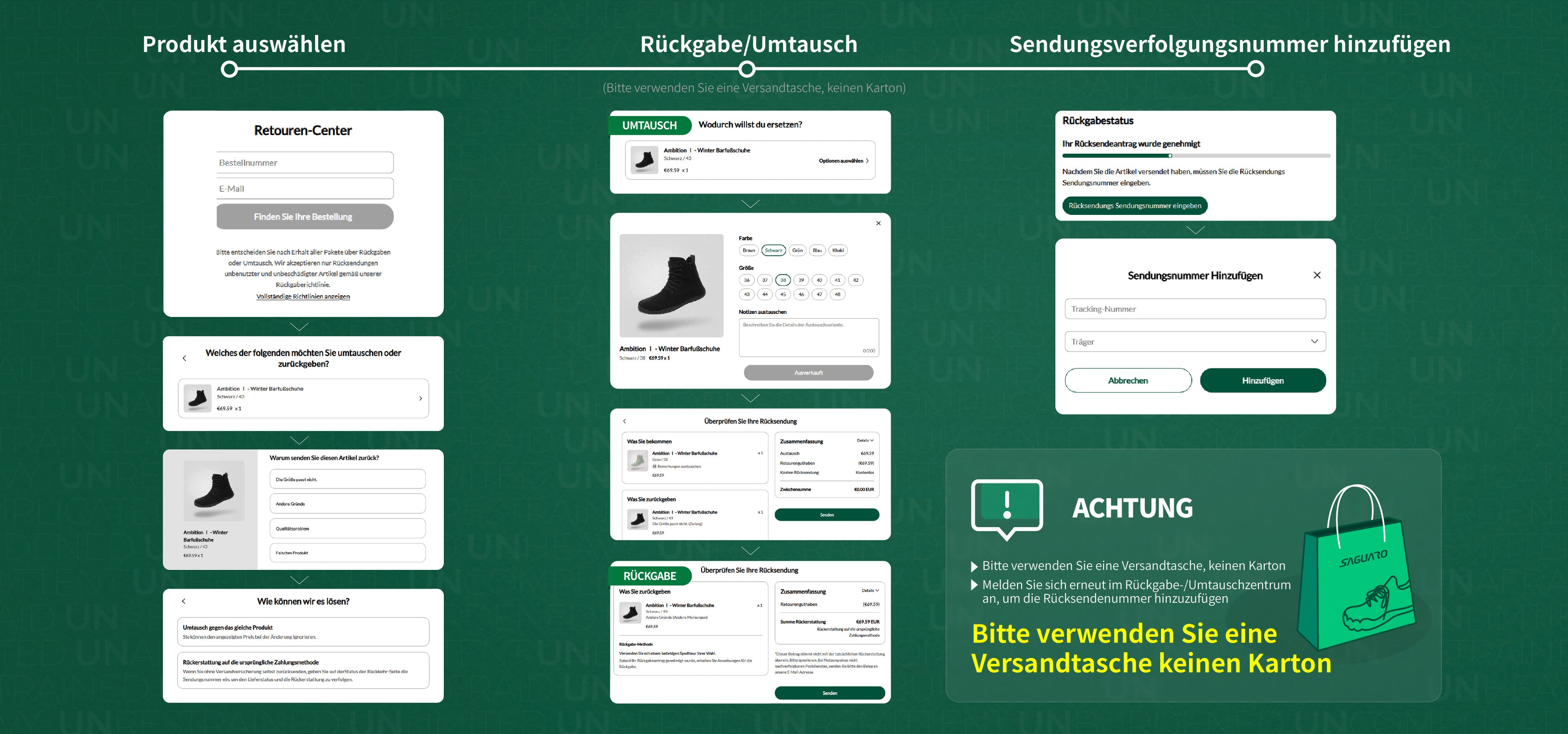 Vielen Dank, dass Sie sich für SAGUARO entschieden haben. Um Ihnen noch mehr Sicherheit und Komfort zu bieten, können Sie optional eine Versandversicherung abschließen. Diese ermöglicht Ihnen kostenfreie Rücksendungen – einmalig für die gesamte Bestellung.